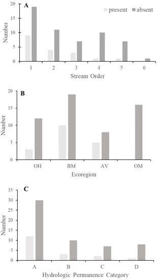 The distribution of A. mohri present and absent sites across stream orders (A), Omernik level III Ecoregions (B) of Ozark Highlands (OH) Boston Mountains (BM), Arkansas Valley (AV), and Ouachita Mountains (OM), and Hydrologic Permanence Categories (C); Poulton and Stewart, 1991).