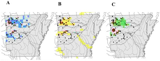 We collected two main types of landscape data: table and raster. Tabular climate and watershed data was collected virtually for all sites via Model My Watershed [53], and it was used in Multiple Logistic Regression (MLR) models (see Statistical analyses and modeling section). Several high-resolution landscape-level rasters were collected for the state of Arkansas to create distribution models of the species (see Statistical analyses and modeling section), including a land use raster (NLCD 2016) [54], a soil variable raster (gNATSGO) [55], and a large-scale environmental data raster (WorldClim) [56].