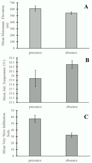 The mean and standard error of maximum watershed elevation (A), July temperatures (B), and the percentage of very fine soils in the watershed (C) for sites where Allocapnia mohri was present and absent.