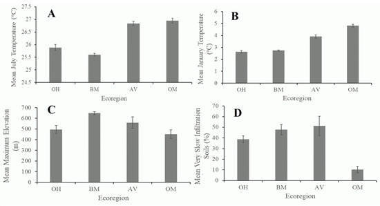 The mean + 1SE of July (A) and January (B) stream temperatures during our study period and of the maximum elevation (C) and percentage of very slow infiltration soils (D) in study reach catchments grouped by ecoregions. Ecoregions move from north (left) to south (right). OH = Ozark Highlands, BM = Boston Mountains, AV= Arkansas Valley, OM = Ouachita Mountains.