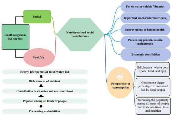 In the Indian sub-continent, SIS of fish in inland water bodies (freshwater wetlands and rivers) are found in sufficient quantity. Except for a few exceptions, most SIS do not integrate into a standard cultural context even though they differ in classification, shape, size, and eating habits. In addition to their unique cultural systems, they are regarded as one of the traditional dishes in most Asian nations, such as India, Bangladesh, Vietnam, Laos, etc., to make up for dietary deficits [,,,]. SIS are a valued food ingredient that supplies a variety of vitamins and minerals in addition to proteins [,] (Figure 2) (Table 2). Small fish species, being widely available, are a boon for persons of lower socio-economic status, even though it allows people to have essential dietary components.