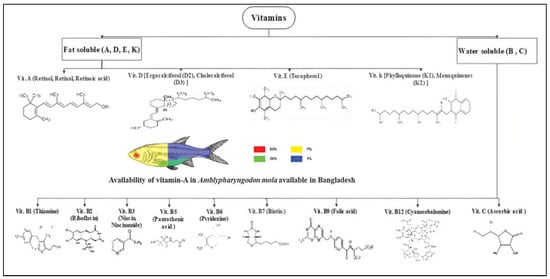 Vitamin A (retinol, retinoic acid) is essential for eye health, immune function, cell growth, and reproduction []. The most common and first sign of Vitamin A deficiency is night blindness (poor vision at night or in dim light). According to WHO, 250,000–500,000 children become blind, and half of them die within 12 months because of losing sight. Humans generally need little amount of this vitamin: the recommended daily allowance of micrograms is 900 micrograms for men and 800 micrograms for women, with an additional dose for pregnant women []. Mola is a vitamin-A-rich SIS consumed by most households in Bangladesh. Twenty-eight species mentioned by Bogard et al. [] are represented in Table 3 with varying vitamin A levels. The only species in which total vitamin A could not be measured was Foli. Mola fish had the most significant levels of vitamin A of the species listed in Table 3 (2503 mg RAE). Mola and cultured mola both had substantial levels of retinol and dehydroretinol, which were 340, 4590, and 323, 4990, respectively []. The aforementioned discussion makes it quite evident that fish are the only food source in Bangladesh that can fully satisfy the needs of SIS for vitamin A []. As a result of poor nutrition, their absence is the primary cause of night blindness [].