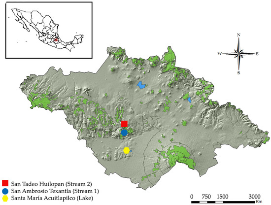 General view of the three study sites, Tlaxcala, Mexico. (A,B) San Ambrosio Texantla (stream 1); (C,D) San Tadeo Huiloapan (stream 2); (E,F) Santa María Acuitlapilco (lake).
