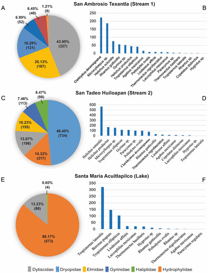 A total of 2924 adult specimens of aquatic beetles, corresponding to 20 species in 15 genera and 6 families (Elmidae, Dryopidae, Dytiscidae, Gyrinidae, Haliplidae, and Hydrophilidae) were recorded at the three study sites (Table 1, Figure 3 and Figure 4, Table S1). San Tadeo Huiloapan (Stream 2) was the site with the highest number of individuals (n = 1515), followed by San Ambrosio Texantla (Stream 1, n = 744), and Santa María Acuitlapilco (Lake, n = 665).