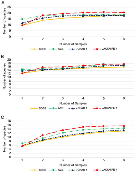 A species accumulation curve represents the accumulated number of species in an area as a function of sampling effort [24,25,26]. Species accumulation curves were evaluated with three non-parametric estimators [27]: ACE (Abundance-based Coverage Estimator), based on a frequency cut-off value of up to ten individuals for rare species; Jackknife 1, which considers that the number of undetected species approximates the number of singletons; and Chao1, which assumes many undetectable species in a highly-diverse assemblage, and thus attempts an accurate lower bound for species richness. Analyses were performed with EstimateS [28].