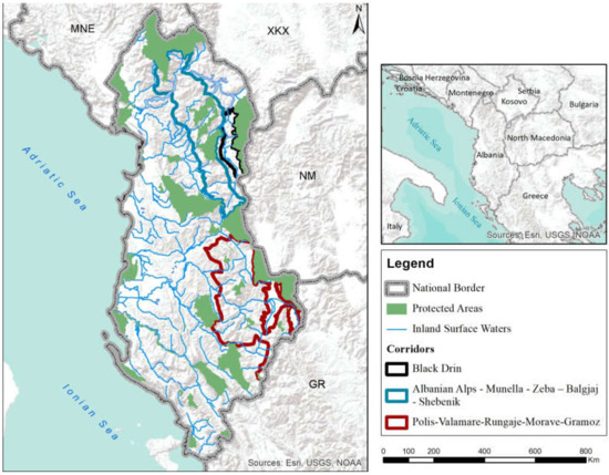 Recent analysis findings [6] reveal that the Government of Albania has approved a System of Environmentally Protected Areas. Currently, the area of the Network of Protected Areas (NPA) of Albania has reached 504,826.3 ha, or 21% of the total area of the country. Of the total area, the Coastal and Marine Protected Areas constitute 119,224.7 ha, or 23.6% of the total surface of the NPAs of the country, of which 13,261.2 ha is only marine area. Also, 98,180.6 ha, are with the status of Ramsar areas, which cover 3.42% of the total area of the country. The effective conservation management of protected areas is a prerequisite for their connectivity performance [7,8,9], while secured conservation connectivity provides opportunities for species survival and performing of life cycles. Further on the connectivity of protected areas systems, it is necessary to facilitate large-scale ecological and evolutionary processes, such as gene flow, migration and species range shifts. These processes are all essential for the persistence of viable populations, especially when facing climatic and environmental changes in increasingly transformed and fragmented landscapes [10]. Improving or sustaining protected area connectivity is therefore a primary concern for the effective conservation and management of biodiversity [11].