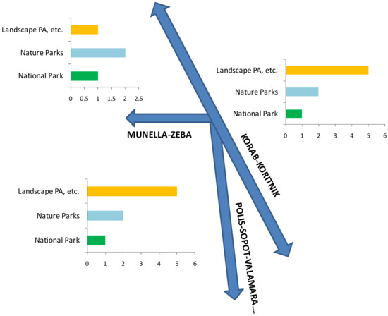 The establishment of the Albanian Ecological Network, i.e., NPA, is based on the fact that networks of connected areas have formed the basis for establishing corridors that extend across regional areas to even wider country contexts and trans-boundary ones (Figure 1 and Figure 2). In Figure 2, the protected areas along the potential landscape corridors are presented.