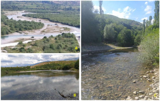 On the map of the Mediterranean region, the Balkan Peninsula is one of the sub-regions representing one of the world’s 25 biodiversity hotspots [12,13] (Myers 2000; Weis, et al., 2018). In the map of global ecoregions [14] (Abell et al., 2008), the Black Drin River and all other tributaries located in the survey focus area are part of the 420-Southeast Adriatic Drainage. It is known that this map of freshwater ecoregions is based on the distributions and compositions of freshwater fish species and incorporates major ecological and evolutionary patterns. Besides this, the complexity of Drini basin and adjacent water drainage makes the delineation a challenging issue. Discharge of all Albanian rivers is seasonally highly variable, being sometimes more than ten times less in summer than in winter. The beds of the main rivers are usually very wide, as a great amount of gravel and pebbles is deposited around the flow itself [15].
