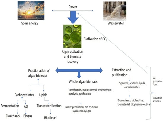 Algal biomass typically consists of the three main macromolecules—carbohydrates, lipids, and proteins with a trace amount of minerals []. The remaining biomass can be utilized for the production of secondary products like biogas, butanol, ethanol, etc., by fermentation, once the important macromolecules have been removed from the algae []. By valorization of algal biomass hydrolysate employing microbial fermentation, several studies demonstrated the generation of bioenergy (biogas, biohydrogen, and bioalcohol) and biochemicals (biopolymers and organic acids) [,].