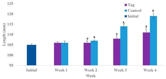Mean total length (mm) of rainbow trout Oncorhynchus mykiss subjected to surgical implantation of a dummy acid-sensitive acoustic tag and a control group over a four-week experimental trial. The control group had significantly longer mean lengths over the four-week period (F2.38, 19.02 = 13.998, p = 0.0001). Means in a week with different letters above are significantly different from each other (p < 0.05).