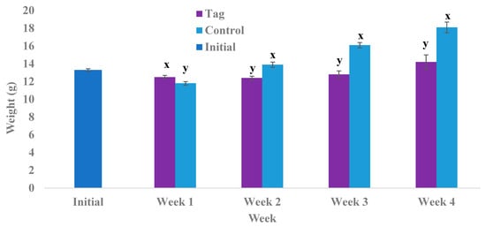 Survival was significantly different between treatments at 100% in the untagged controls compared to 92% in the tagged fish (p = 0.041). All mortality occurred in the first week. Tag retention was 76%, with two tags lost in the second week, three tags lost in the third week, and one tag lost in the fourth week. Mean lengths were significantly different between the tagged and untagged fish over the course of the trial (F2.38, 19.02 = 13.998, p = 0.0001, Figure 1). Subsequent one-way ANOVA indicated that the control fish were significantly longer beginning in the second week and continuing to the end of the experiment. Similarly, untagged fish were also significantly heavier over the course of the trial (F1.36, 10.91 = 19.365, p = 0.001, Figure 2). Beginning at week 2, the control fish began gaining weight significantly faster. Over the course of the trial, the control fish grew 14 ± 1 mm and gained 4.8 ± 0.6 g while the tagged fish grew 6 ± 1 mm and gained 0.9 ± 0.9 g.