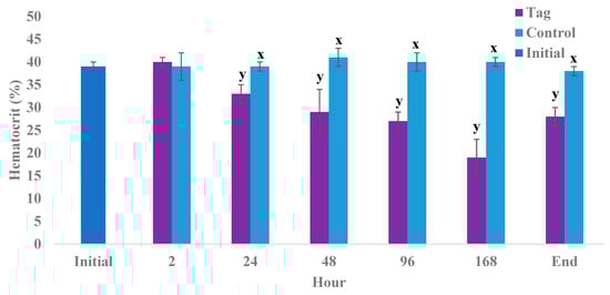 Hematocrit is a measure of the capacity of red blood cells to carry oxygen through the body. Thus, a reduction in hematocrit means a reduced ability to effectively function at optimum levels []. The untagged fish in this study maintained a 40% hematocrit level throughout the trial, which is well within the normal range of 30–40% []. However, the tagged fish were clearly anemic. Hematocrit levels of tagged fish began lowering within 48 h after surgery and continued to decrease for 168 h (7 days), finally reaching a nearly 50% reduction. By the end of the trial (30 days), hematocrit levels of tagged fish were still approximately 30% lower than the initial values and those of the control group. Reduced hematocrit (anemia) in fish is usually associated with infection [], parasites [], or toxins in the diet or water [,]. Rainbow trout with as little as a 22% reduction in hematocrit have been shown to have significant reductions in critical swimming velocity and maximal oxygen uptake [].