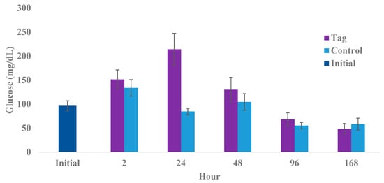 Increases in glucose, a secondary stress response, are not as immediate as primary stress markers []. As expected, both the tagged and control groups’ glucose levels fluctuated at similar rates despite the relatively high variance throughout the experiment. The glucose levels observed were relatively lower than the normative values of 108 ± 9.98 mg/dL reported for rainbow trout []. However, glucose levels in both the tagged and untagged control fish rose and fell along the same points throughout the experiment. The initial glucose stress response and return to basal levels found in this experiment were similar to other studies also using rainbow trout [,,,].