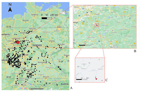 From 2015 to 2022, 6798 niphargids were collected from 917 locations (caves, artificial cavities, springs, river interstitial sites, wells) in Germany (Figure 1A) and identified morphologically [10,14,23,25]. In total, 824 specimens in 96 locations (5 river interstitial sites, 7 helocrene sites, 3 limnocrene sites, 54 rheocrene springs, 2 spring basins, 13 caves, 11 artificial caverns and 1 shaft well) originated from North Rhine–Westphalia, of which 135 specimens were analyzed in order to determine their COI, 28S rRNA, and ITS2 sequences. The closest caves where we collected Niphargus successfully were Gesshardshöhle (51.26° N, 7.65° E) and Kückelshauser Klutert (51.34° N, 7.44° E).