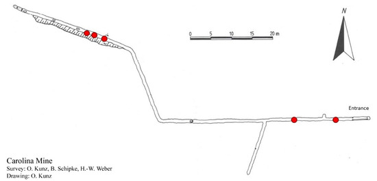 Plan of the Carolina Mine from 1992, sourced from Arbeitsgemeischaft Höhle und Karst Sauerland Hemer e.V. Red dots represent the sites where specimens of Niphargus carolinensis sp. nov. were found.