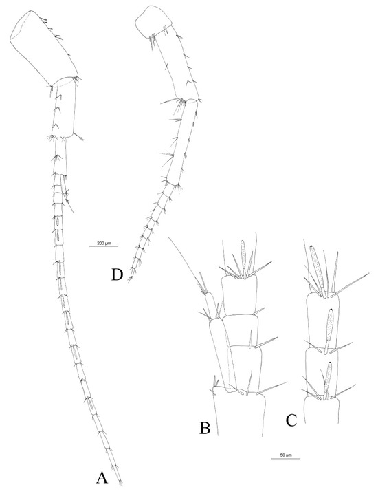 Niphargus carolinensis sp. nov. male antenna I (A), details of accessory flagellum (B) and aestethascs (C) and antenna II (D).