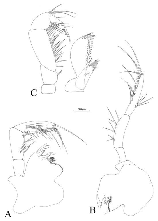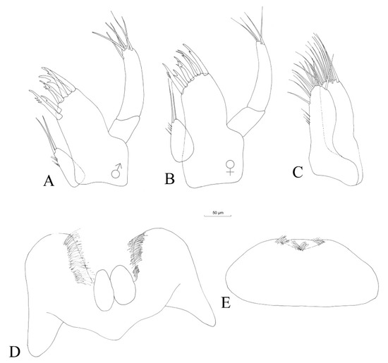 The mandibular palps (Figure 7A,B) are highly similar and of the same length. The three articles of mandibular palps account for 17.9% (article 1), 35.7% (article 2) and 46.4% (article 3) of the total length of the palp (Table 3). Proximal article without setae, median article with 7–8 ventral setae and distal article of the palp with one group of 3–4 A setae, three groups with 1–2 B setae, 9–11 D setae and 4–5 E setae (for the nomenclature of mandibular palps setae, see [40].