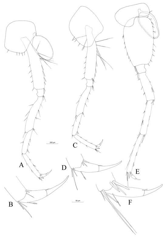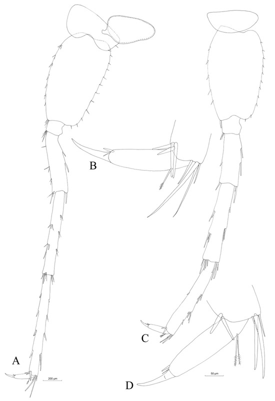 At the laboratory, the specimens (DW220205-01 male and DW 220907-01 female) were immersed in glycerol, and the dissected body appendages were mounted on slides using Kaiser’s glycerol gelatin (Merck KGaA, Darmstadt, Germany). The slides were inspected with an Olympus SZX16 stereomicroscope and provided with an Olympus SC180 camera and a microscope Olympus BX51, as well as the Olympus SC50 camera. The drawings were performed upon printed photographs via manual inking and the continuous inspection of the slides under the microscope. The terminology used for body parts, as well as the choice of appendages taken into consideration for measurements, are those previously described [40].