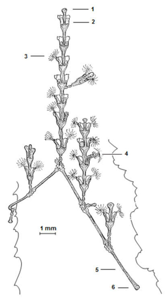Dynamena pumila shoot morphology. Designation: 1—shoot growing tip; 2—hydrotheca; 3—corolla of hydranth tentacles; 4—hydranth swallowing nauplii; 5—stolon; 6—growing tip of the stolon.