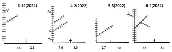 Schemes of young secondary (grown from individual shoots) colonies of Dynamena pumila used in the experiment before the increase in water temperature on 9 June 2022. The horizontal line shows the length of the stolon modules (the internodes between shoots) in mm. Pairs of hydranths on the trunks and branches of the shoots are indicated by transverse lines, and their number replaces the measurement of the shoots. Colony numbers are indicated above the diagrams.