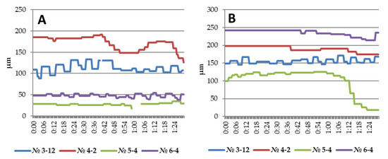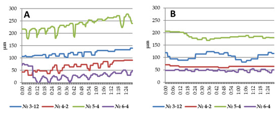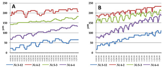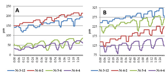 The terminal stolon tip pulsations in four Dynamena pumila colonies (A) on the sixth day and (B) on the tenth day of recovery at 15–16 °C. On the “X” axis is the time from the beginning of the experiment (h:m).