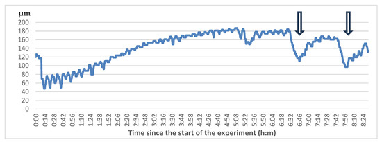 The pulsations of the top of the stolon of the Dynamena pumila colony No. 6-4. Filming time: 8 h 27 min. Arrows indicate sharp displacements of the growing tip from the end of the perisarcal tube of the stolon.