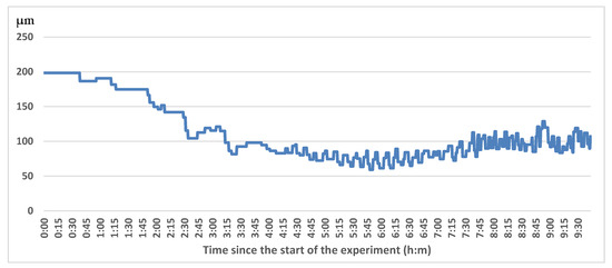 On 20 June 2022, the sixth day at 15–16 °C, in all four colonies, the pulsations of the stolon tips were restored (Figure 8). The pulsation period became longer than at the beginning of the experiment at 14 °C (Table 2). The amplitude of the pulsations increased but due to significant variations, the difference from the amplitude at the end of the thermal shock stage turned out to be less clearly expressed (p ≤ 0.05). The growth of the colonies not only recovered but also intensified. The increase in the stolon per hour exceeded the initial values at the beginning of the experiment at 14 °C (p ≤ 0.05). The ratio of the phases of rest and the stretching of the stolon tip and its compression became the same as at the beginning of the experiment. The extension phase was almost twice as long as the compression phase, which is typical of normal growth pulsations.