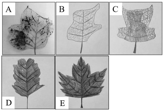 Visual depictions of representative leaves within different skeletonization categories and surface area quantiles. (A) a photograph of a real tulip poplar leaf of skeletonization category (SkC) 5, and surface area quantile (SAQ) 50%; (B) a sketch of a tulip polar leaf of SkC 5 and SAQ 25%; (C) a sketch of a tulip poplar leaf of SkC 3 and SAQ 75%; (D) a sketch of a red oak leaf of SkC 1 and SAQ 50%; (E) a sketch of a red maple leaf of SkC 1 and SAQ 100%.