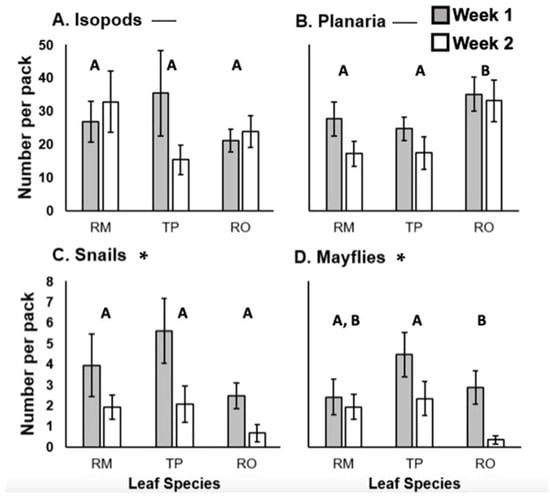 The number of mayflies in the stream (Figure 2D) was significantly impacted by both the leaf species (F2, 80 = 3.683, p = 0.030) and the time of conditioning (F1, 80 = 9.569, p = 0.003), while the interaction term was not significant (F2, 80 = 2.620, p = 0.079). There were significantly more mayflies collected in the first week and in leaf packs composed of tulip poplar than in those of red oak, but all other pairwise post hoc comparisons were not significant.