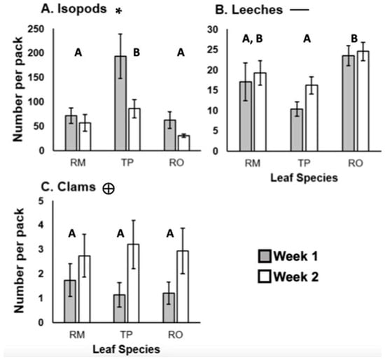 The effect of type of leaf and length of time in Scout Pond on the average (±1SE) density of (A) isopods (Caecidotea communis; ffg = detritivores/grazers), (B) leeches (predominantly Helobdella stagnalis; ffg = carnivores), (C) clams (Sphaeriidae; ffg = collectors). Leaf species are arranged in order of descending predicted colonization densities. RM = red maple; TP = tulip poplar; RO = red oak. Note the different y-axis values. N = 15 for all bars. ffg = functional feeding group. Different letters above the bars indicate statistically significant differences among types of leaves. After the name of the taxon, — indicates no significant difference between collection dates, * indicates significantly more animals present in the first week, and ⊕ indicates significantly more animals in the second week.