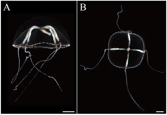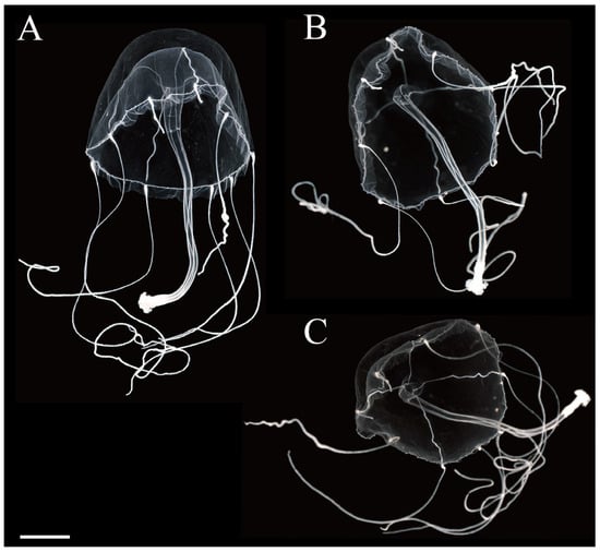 Taxonomic observations and measurements were conducted on both live and preserved specimens (Figure 1). Medusae were placed and flattened on a glass dish (diameter 50 mm). The umbrella height was measured from the apex of the umbrella to the umbrella margin. The umbrella diameter was measured across the turnover of the exumbrella. Specimens were photographed under a compound microscope (SZ61, OLYMPUS, Tokyo, Japan) using an OLYMPUS OM-D E-M5 MarkII. Measurements were made using methods previously [6] with ImageJ software to the nearest 0.01 mm [25].