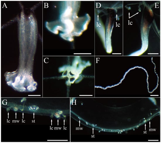 Live mature medusa of Eutima onahamaensis sp. n.: (A) manubrium, (B) mouth, (C) stomach, (D,E) tentacular bulb, (F) tentacle, (G) statocyst, (H) umbrella margin. lc = lateral cirri; mw = marginal wart; st = statocyst. Scale bars: 0.2 mm.