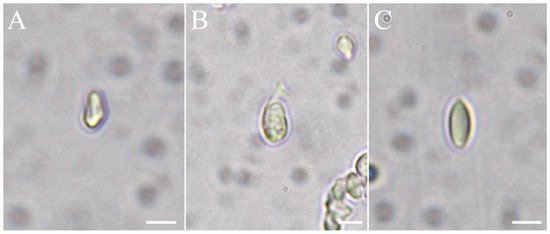 Nematocysts of Eutima onahamaensis sp. n.: (A) merotrichous isorhiza, (B) basitrichous isorhiza, (C) artichous isorhiza. Scale bars represent 5 µm.