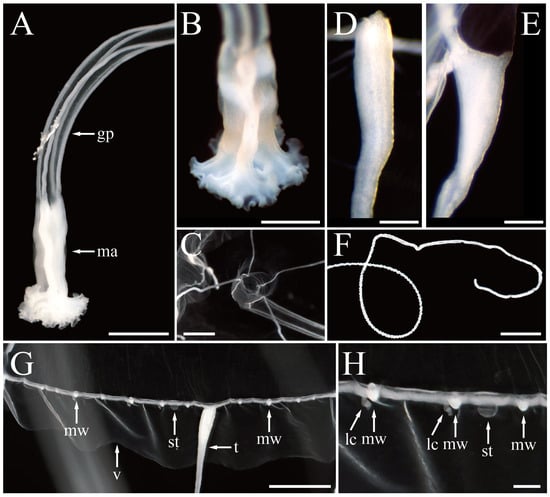 Material examined. NSMT-Co1849; Off Itoman, Itoman, Okinawa Prefecture, western Japan; 26°7′6.41″ N, 127°35′53.36″ E; 20 April 2022; collector: Sho Toshino. Description. Mature medusae umbrella flat (Figure 5A), 8.7 mm high and 10.4 mm in diameter. Umbrella apex rounded and mesoglea thickened. Exumbrella smooth and nematocysts sparsely scattered (Figure 5A–C). Manubrium hanging in the umbrella cavity, tubular, and whitish in color (Figure 6A,B). Gastric peduncle very long and distinct. Gastric peduncle length about 25 mm, three times the length of umbrella diameter, extended beyond umbrella margin. Mouth cruciform, with four frilled lips. Four radial canals and a circular canal (Figure 6C). Gonads linear, extending along almost the entire length of radial canals and gastric peduncle (Figure 6A). Tentacular bulbs four, swollen, whitish in color (Figure 6D,E). Tentacles nine, filiform, tapering to a tip, length about three times the umbrella diameter (Figure 6F). The four tentacles are arranged perradially and four interradially, but an additional tentacle is included due to malformation. Marginal warts 96, usually 11–13 between successive tentacles (Figure 6G). Statocysts eight (Figure 6G,H). Marginal warts and tentacular bulbs with lateral cirri and without adaxial papillae (Figure 6H). Velum narrow, 1/5 of umbrella diameter.