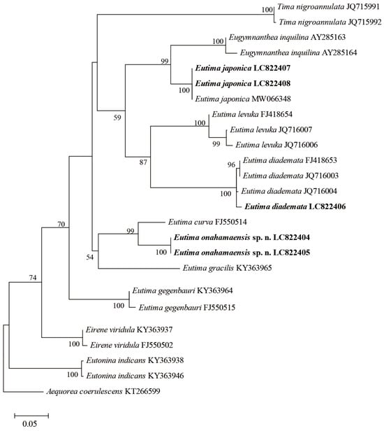Near-complete sequences of the mitochondrial 16S rDNA gene (approximately 600 bp) were used for molecular phylogenetic analysis. Genomic DNA was extracted from the ethanol-preserved tissue of the cultured specimens using the DNeasy Blood and Tissue Kit (QIAGEN, Hilden, Germany) according to the manufacturer’s instructions. The 16S rDNA was PCR-amplified and sequenced with the forward and reverse primer pair TCGACTGTTTACCAAAAACATAGC and ACGGAATGAACTCAAATCATGTAAG [26], using the following PCR profile: initial denaturation at 94 °C for 5 min; five cycles at 94 °C for 50 s, 45 °C for 50 s, and 72 °C for 60 s; 30 cycles at 94 °C for 50 s, 50 °C for 50 s, and 72 °C for 60 s; and final elongation at 72 °C for 5 min [27]. The PCR products were purified using a QIAquick PCR Purification Kit (Qiagen) and sequenced in both directions using an ABI 3730 automated sequencer (Applied Biosystems, Bedford, MA, USA). The new sequences were aligned using MEGAX with built-in ClustalW [28]. Phylogenetic analysis and pairwise distance measurements were performed using the maximum likelihood method based on the Kimura 2-parameter model [29], with 1000 bootstrap replications in MEGAX. Five sequences of the Eutima species were deposited in GenBank under the accession numbers LC822404-822408 (Table 1).