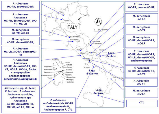 Several cases of Italian lakes (Figure 1) have been studied by our group over the course of several years, revealing widespread contamination in the environment due to cyanotoxins originating from periodic toxic blooms that occur in these water bodies. Here, we present three emblematic cases: Lake Vico (Lazio, Viterbo, Italy), Lake Albano (Lazio, Rome, Italy), and Lake Occhito (Molise, Campobasso, Italy).