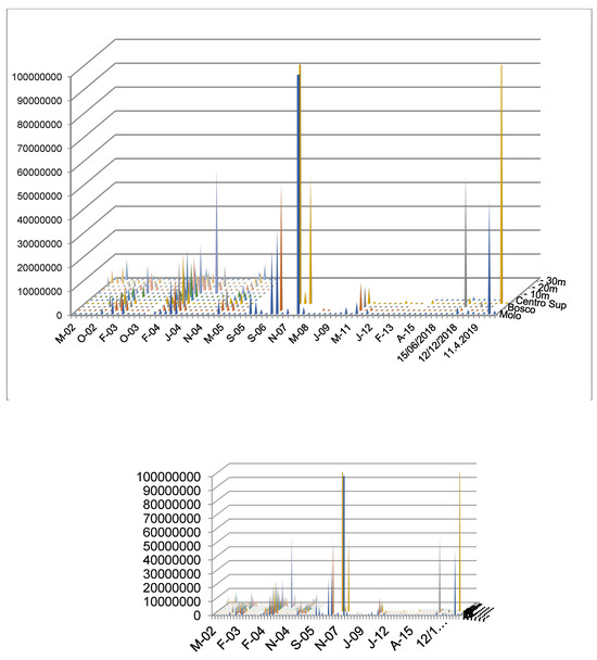 Planktothrix rubescens population (cells/L) in Lake Albano from March 2002 to January 2020. Sampling sites are indicated by colors.