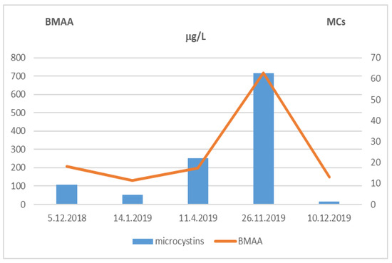 BMAA and microcystins amount in Albano during 2018–2019 (μg/L).