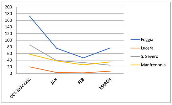 Epidemiological data up to 2013 related to the incidence of diseases such as Alzheimer’s disease and dementia were provided by epidemiological centers of the regions of Puglia and Molise, covering municipalities in the provinces of Foggia and Campobasso as reported in Figure 6. Considering the larger municipalities of the province of Foggia (Foggia, Lucera, Manfredonia, San Severo), a higher number of cases were detected in the capital municipality, and incidence percentages similar to those recorded in Foggia in recent years were also observed in municipalities closer to the Occhito reservoir (Figure 6). The first municipalities presented in the legend are located close to the Occhito basin.