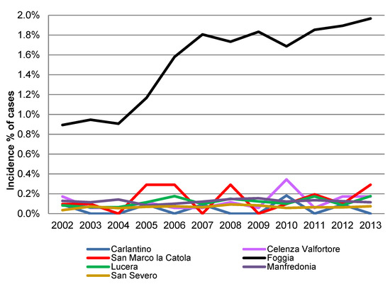 Cases of Alzheimer’s/dementia (% of the population) in Pugliese municipalities during 2002–2013.