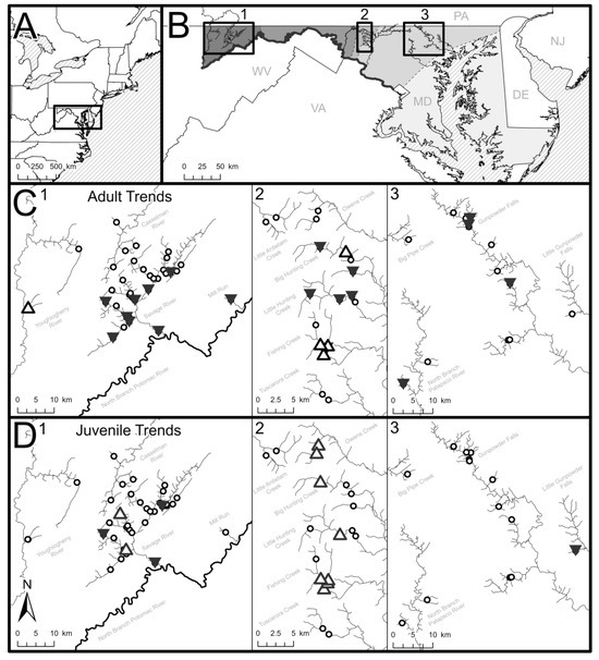 (A) The study region where brook trout density data were collected in Maryland, USA (shown as inset box). (B) Inset maps are defined for study sites within (1) Appalachian Plateau, (2) Blue Ridge, and (3) Piedmont physiographic regions (shaded in greyscale) and correspond with the (C) adult and (D) juvenile brook trout temporal trend locator maps. Significantly increasing temporal trends in fish density are shown by hollow, upward-facing arrows (increasing Sen’s slope; Mann–Kendall p < 0.01), significantly decreasing temporal trends in fish density are shown by filled, downward-facing arrows (decreasing Sen’s slope; Mann–Kendall p < 0.01), and sites lacking significant temporal trends are shown with open circles.
