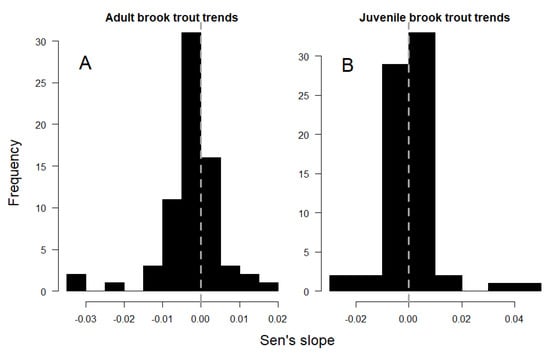 Distribution of temporal trends in adult (A) and juvenile (B) brook trout density across study sites (Figure 1).
