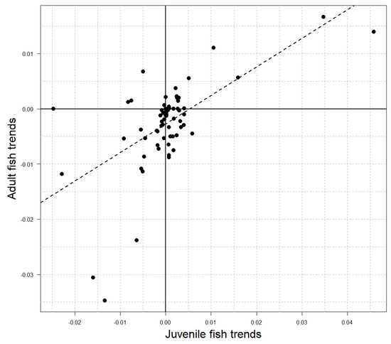 Juvenile fish densities did not exhibit a singular temporal trend within the study area, as indicated by the symmetrical distribution of Sen’s slope values about 0 (Figure 2B; Wilcoxon p = 0.8). However, 10 sites (14%) showed significant increases in juvenile fish densities over time, and 4 sites (6%) showed decreases (Figure 1; Mann–Kendall p < 0.1; respectively). Temporal trends in adult and juvenile density were positively associated across sites (Table 2), and a linear model described the relationship with a slope of 0.52 and R2 of 0.38 (Figure 3).