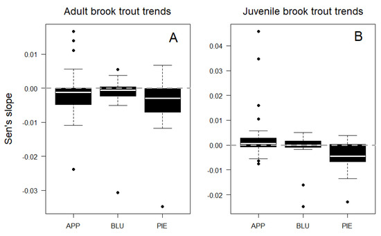 We observed stronger temporal trends for adult fish than juvenile fish: 24 sites showed significant (p < 0.1) temporal change for adult age classes, whereas 14 sites were significant at this statistical threshold for juvenile fish. This result is consistent with prior work demonstrating greater interannual variation in the abundance of juvenile brook trout than adults [52], with an associated decrease in statistical power to detect trends in juvenile brook trout recruitment and abundance [53]. For example, Childress et al. [3] observed similar environmental associations for adult and juvenile brook trout trends in the Blue Ridge region, but juvenile fish models exhibited larger confidence intervals (i.e., more likely to encompass zero).