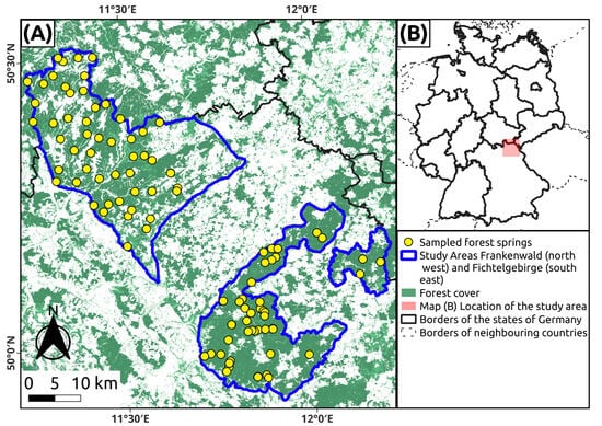 (A) The study areas of Frankenwald and Fichtelgebirge are located in northeastern Bavaria, Germany. The map shows the study areas based on the “Naturräumliche Gliederung Bayerns” [] in blue as well as the locations of the sampled springs (yellow dots). In Frankenwald and Fichtelgebirge, 52 and 50 springs, respectively, were investigated as permanent sites since 1996. Forest cover is based on the Copernicus Forest Type 2018 product []. (B) The location of the study area in northeastern Bavaria within Germany. Thick, black lines represent the states of Germany, and dotted lines the neighboring country borders.