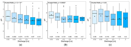Comparison of spring discharge with the pH value of spring water presented as boxplots. The box represents the interquartile range between the 25th and 75th percentile of the data, the vertical lines the minimum/maximum range, and black dots above/below the lines represent outlier values. The thick, horizontal line represents the median value, with the black dot next to it representing the mean. Colors indicate different levels of discharge. The period of data collection lies between 1996 and 2020. The scaling of spring discharge is based on the descriptive classification of spring discharge from Table 2. The number of observations differs for each class. Springs with high discharge tend to be rare. In figure (a), the values of Frankenwald and Fichtelgebirge are combined; in (b) only Frankenwald and in (c) only Fichtelgebirge are considered.