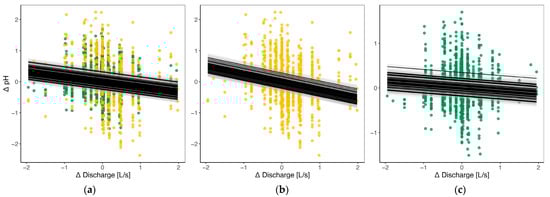 All model parameters including effect sizes (β), standard error, and t-values of fixed effects as well as variation (σ2) and standard deviation (σ) of random effects are presented in Table 3. Fitted LMMs for Δ pH against Δ discharge are shown in Figure 4, with spring location as a random intercept term. The fixed effect of Δ discharge was found to have a statistically significant influence on Δ pH for all three datasets. The model fitted for Frankenwald showed the strongest slope of −0.255, compared to −0.0677 for Fichtelgebirge and −0.163 for both regions. In general, we found that decreasing discharge was weakly to moderately associated with an increase in pH values.
