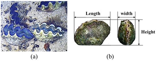 Tridacna crocea clams inhabiting the shallow sea (a) and measured shell size parameters (b).