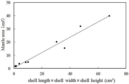 In this experiment, strong relationships existed between the fresh and dry masses and the product of shell length × shell width × shell height of the T. crocea clam (Figure 4). A similar relationship can also be observed in the estimation of biomass information from the sample size for other clam species. By investigating these relationships in advance, it may be possible to observe, for example, changes in the fresh and dry masses over time for the same individual using measurements of shell size parameters of living clams.