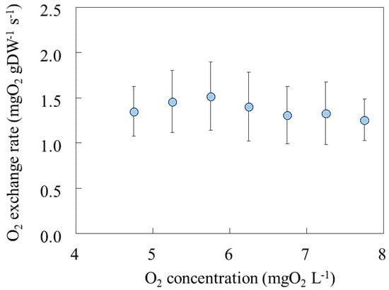 The oxygen exchange rate of clams is considered to be an indicator of the net photosynthetic rate of the system consisting of zooxanthellae and T. crocea, which is carbon source gain activity in clams. The dissolved oxygen concentration affects the photosynthesis of zooxanthellae []. Terefore, the effect of the dissolved oxygen concentration on the oxygen exchange rate was investigated.
